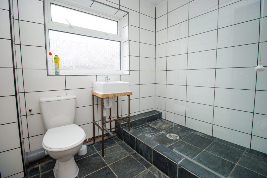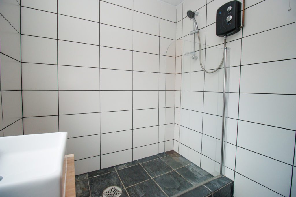 Large walk-in shower. Handbasin and wc. Slate tiled floor. Tiled walls. Cupboard housing hot water tank. Upvc double glazed window.