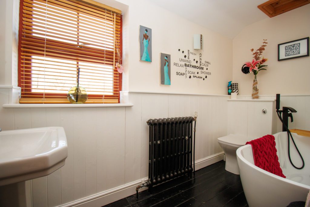 Free standing bath, handbasin and wc. Exposed wood floor. Feature radiator. Sealed unit double glazed window in timber frame. Loft access.