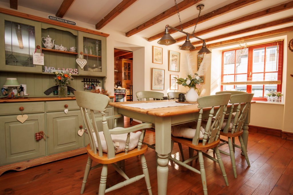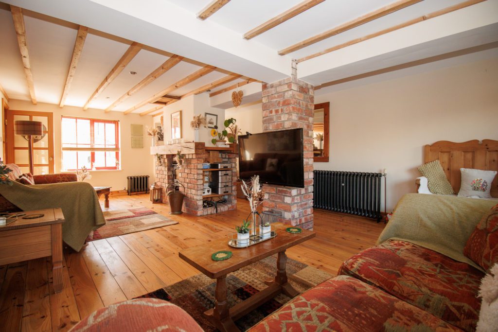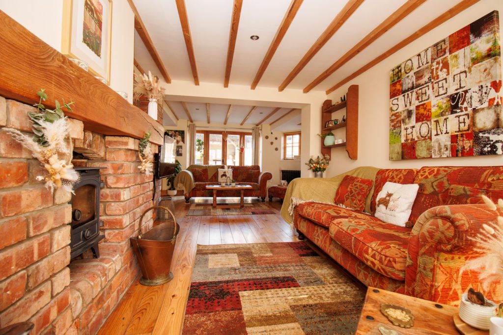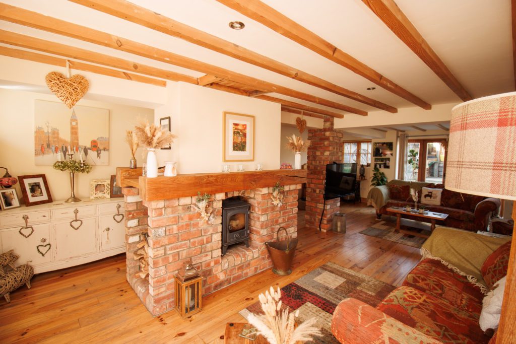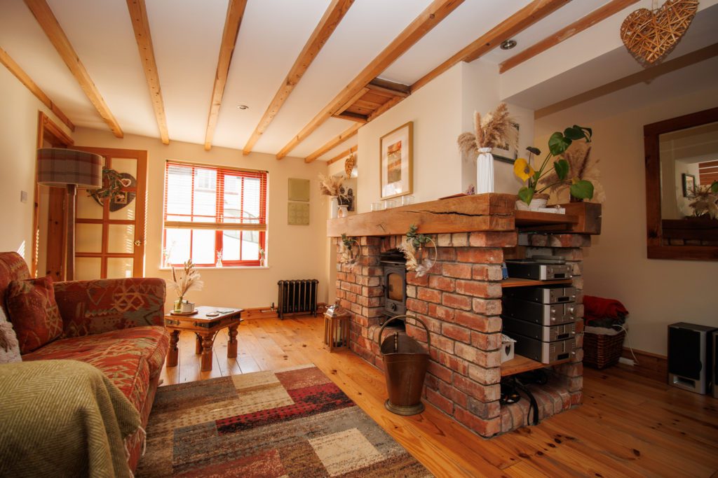 Log burner in exposed brick fireplace with timber mantle. Exposed beamed ceiling. Hardwood floor. Understairs cupboard. Inset spotlights. Two sealed unit double glazed windows in timber frame. Double doors to garden.