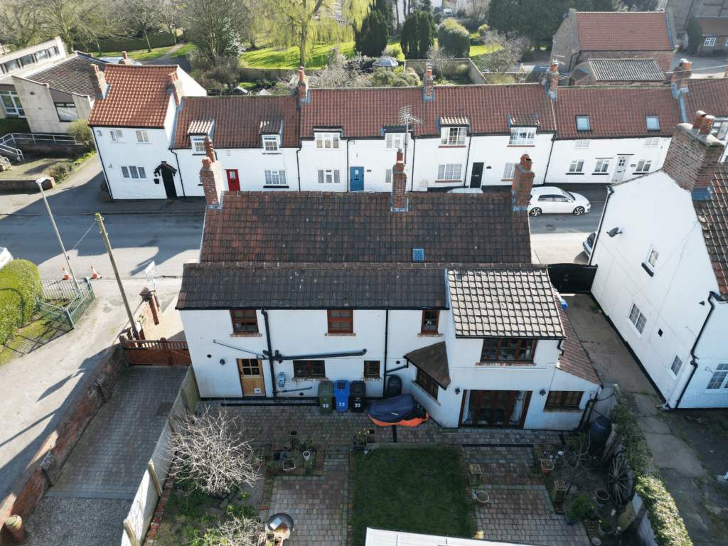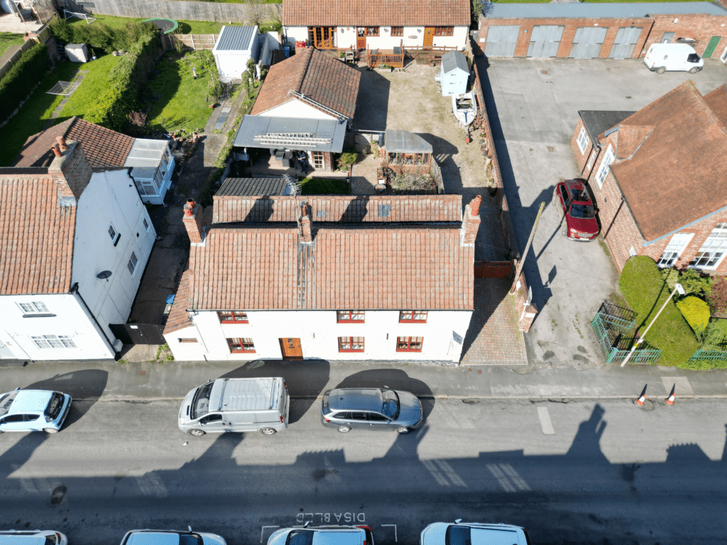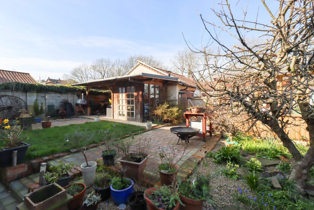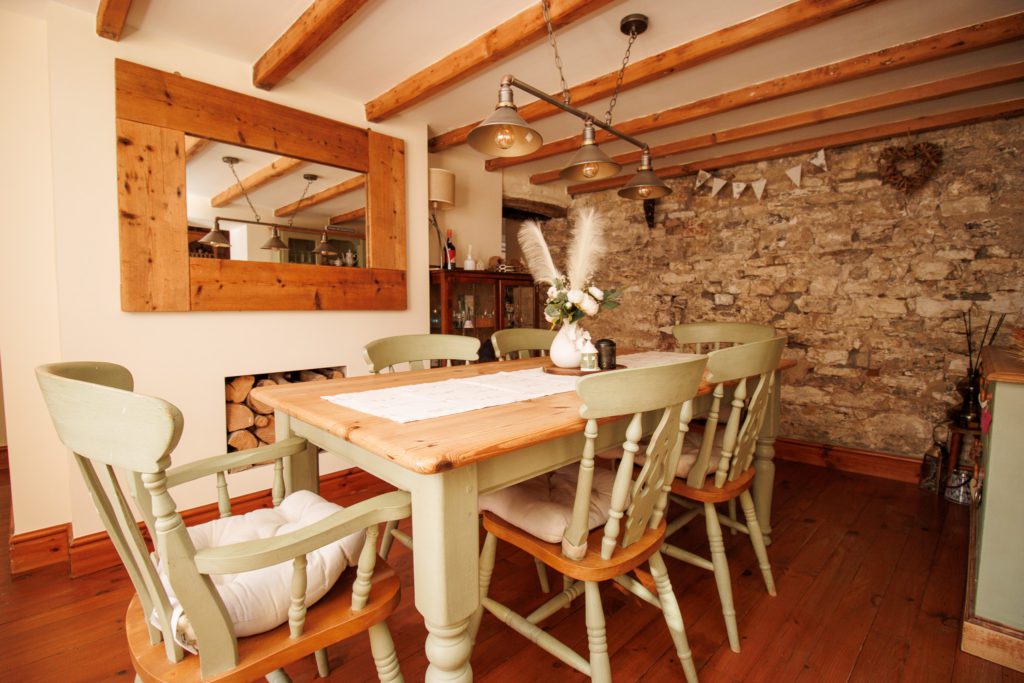 Log burner in exposed brick fireplace with timber mantle. Exposed beamed ceiling. Hardwood floor. Understairs cupboard. Inset spotlights. Two sealed unit double glazed windows in timber frame. Double doors to garden.