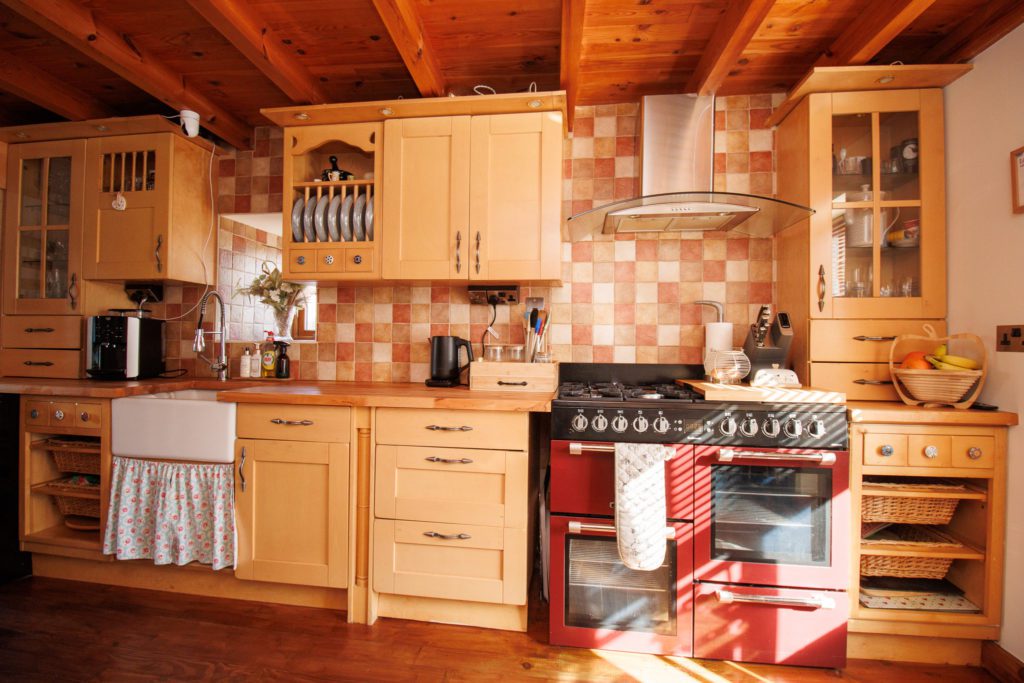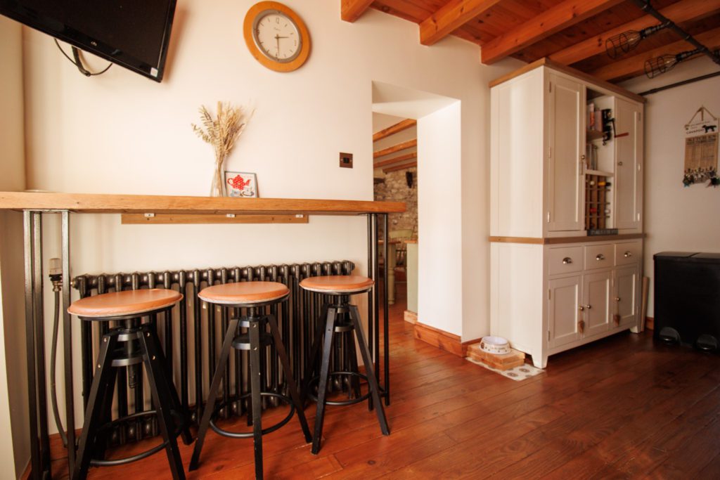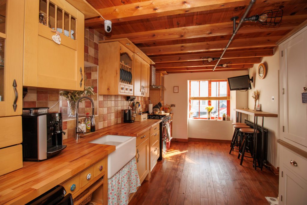 Inset Belfast sink. Base cupboards with wooden worktops over. Matching wall cupboards over. Breakfast bar. Double range cooker with gas hob with extractor hood above. Inset spotlights. Plumbing for dishwasher. Feature radiator. Hardwood floor. Exposed beamed ceiling. Sealed unit double glazed windows in timber frames.