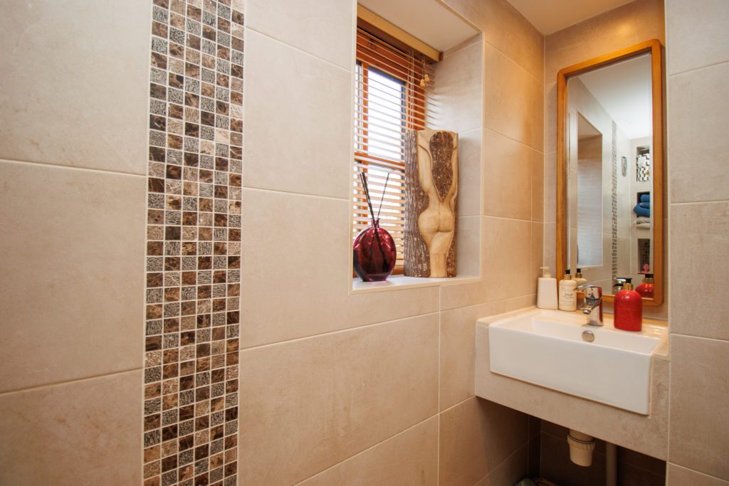 Rain shower. Handbasin in vanity unit and wc. Inset spotlights. Chrome towel radiator. Sealed unit double glazed window in timber frame.